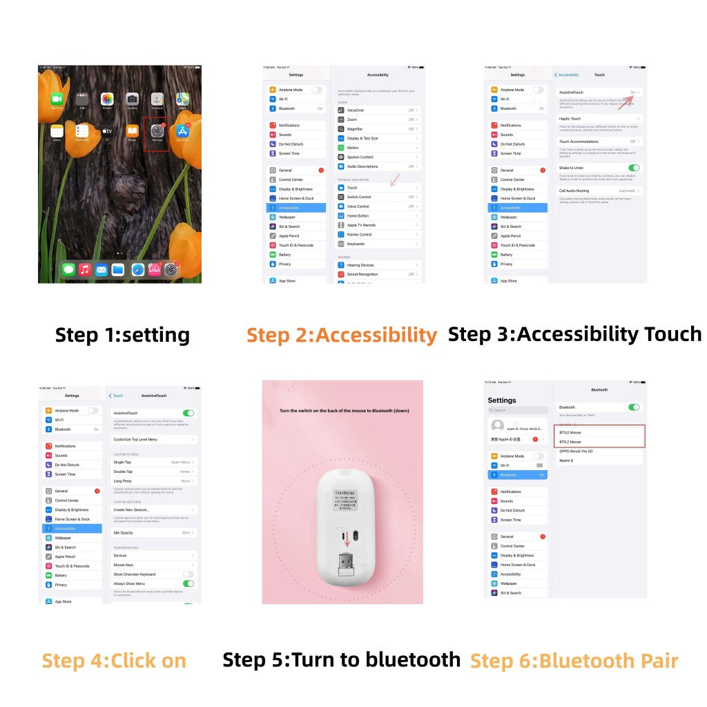 Características do produto: 1, design ultrafino, elegante e conveniente;2, forte capacidade anti-interferência, longa distância de trabalho de até 10m3, design inteligente de luz vermelha com economia de energia, longo tempo de espera4, zíperes de roda de rolagem, você através das webs com facilidade e velocidade Nota: 1, não desmonte o produto sozinho2, evite cair3, evite água Conexão 2.4G: ao usar:1, insira o receptor USB na parte inferior do mouse no computador2, abra o botão liga / desliga na parte inferior do mouse, então você pode usá-lo normalmente!(Observe que neste pedido, emparelhamento rápido) Uso de Bluetooth 1, ligue para a posição ON, ligue o bluetooth do dispositivo e clique no mouse BT3.0 ou no mouse BT5.2 Como conectar o mouse para iOS:Você precisa atualizar para iOS 13 ou superior,configuração ? Acessibilidade ? Toque ? Acessibilidade Toque ? Ligue seu telefone ou tablet e procure emparelhamento