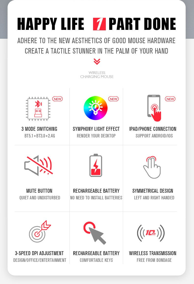 Rato sem fio bluetooth recarregável com 2.4ghz usb rgb 1600dpi mouse para comput