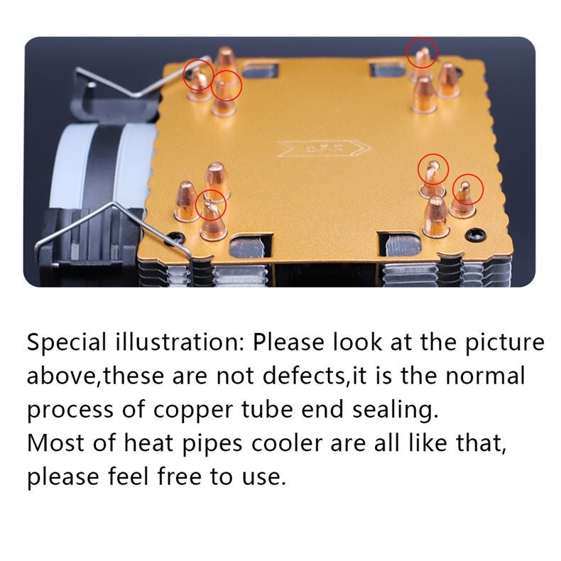 Special illustration: Please look at the picture above,these are not defects,it is the normal ,process of copper tube end sealing.Most of heat pipes cooler are all like that,please feel free to use.